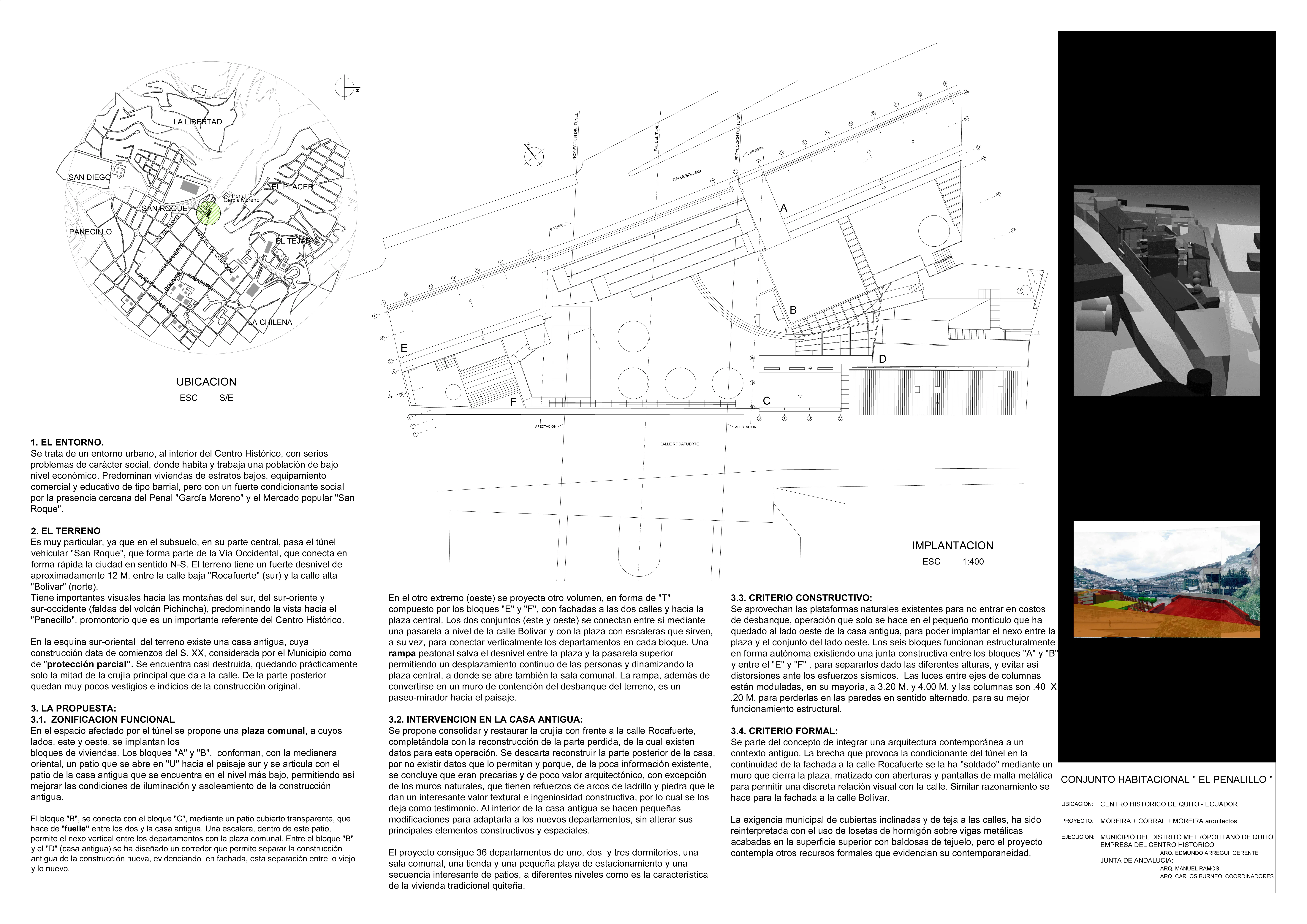 La propuesta plantea un conjunto cerrado que aprovecha una planicie en el lote adjunto, generada durante las obras del túnel de San Roque. En este espacio donde las condicionantes técnico-económicas no permitían construir, se propone un amplio patio-jardín como núcleo generador de distintas actividades. Este patio está rodeado por dos nuevos edificios, uno al oriente y otro al occidente con sus respectivos patios centrales, retomando la tipología tradicional de este sector. Se adoptó una coherente adaptación con el terreno y la vivienda existente y se plantearon escalinatas, rampas y pasarelas que a más de estar ubicadas en lugares que permiten una perfecta funcionalidad e interconexión de los distintos espacios, permiten admirar el entorno geográfico que rodea al conjunto. La propuesta buscó conciliar las variantes de la arquitectura tradicional con un concepto formal y funcional contemporáneo.