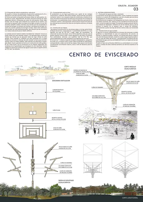 Arquitectónicamente, se adopta un sistema modular de paraboloides de 8x8 metros, construidos enteramente con estructura de caña guadua, lo que permite una construcción flexible, sismo-resistente y ejecutable por etapas. La propuesta busca fortalecer la economía circular del sector mediante el trabajo colaborativo con la comunidad, promoviendo el uso de mano de obra local y la puesta en valor de los conocimientos tradicionales vinculados a este material.